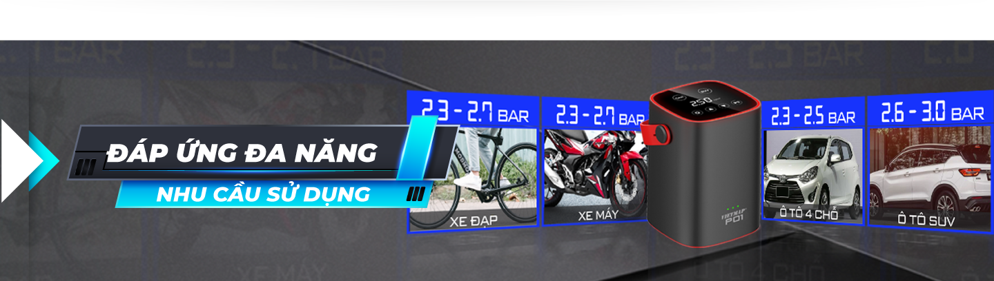 Phụ hiện ô tô VIETMAP P01, thiết bị bơm điện tử đa năng, đáp ứng nhiều nhu cầu sử dụng: dùng để bơm lốp ô tô, xe máy, xe đạp, nệm hơi, vật dụng gia đình đều rất phù hợp và đơn giản.